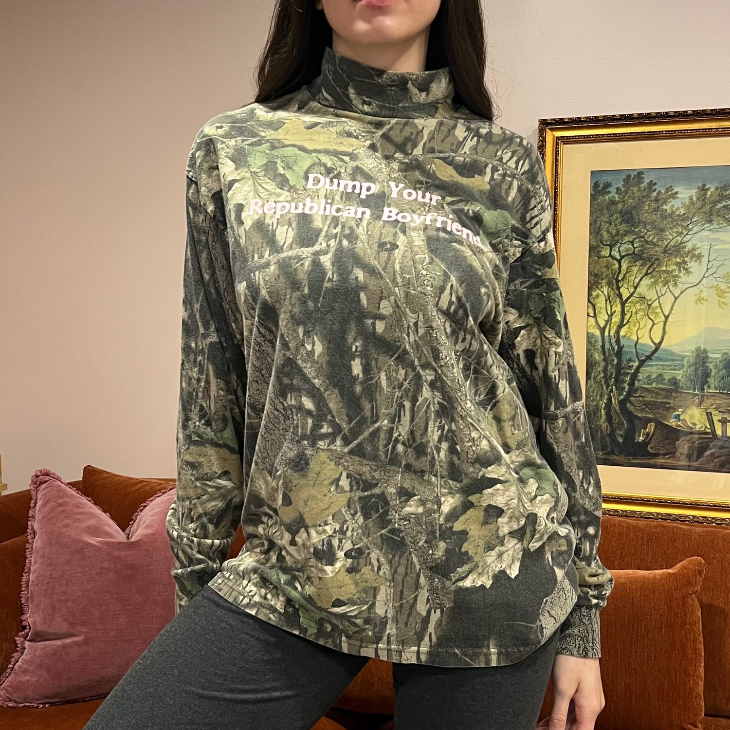 DUMP YOUR REPUBLICAN BOYFRIEND camo turtle neck t-shirt with pink text (L)