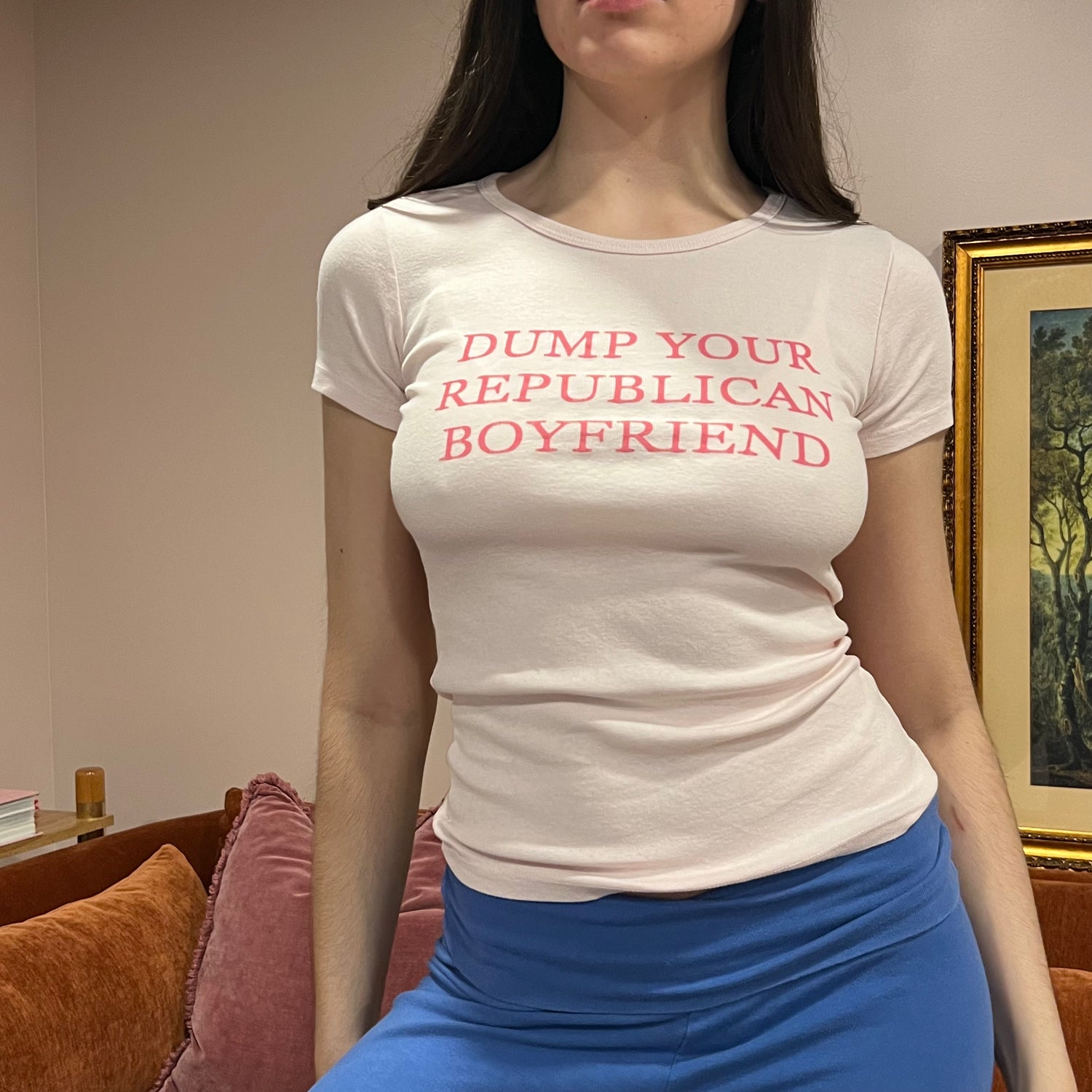 DUMP YOUR REPUBLICAN BOYFRIEND pink t-shirt with pink text (S)