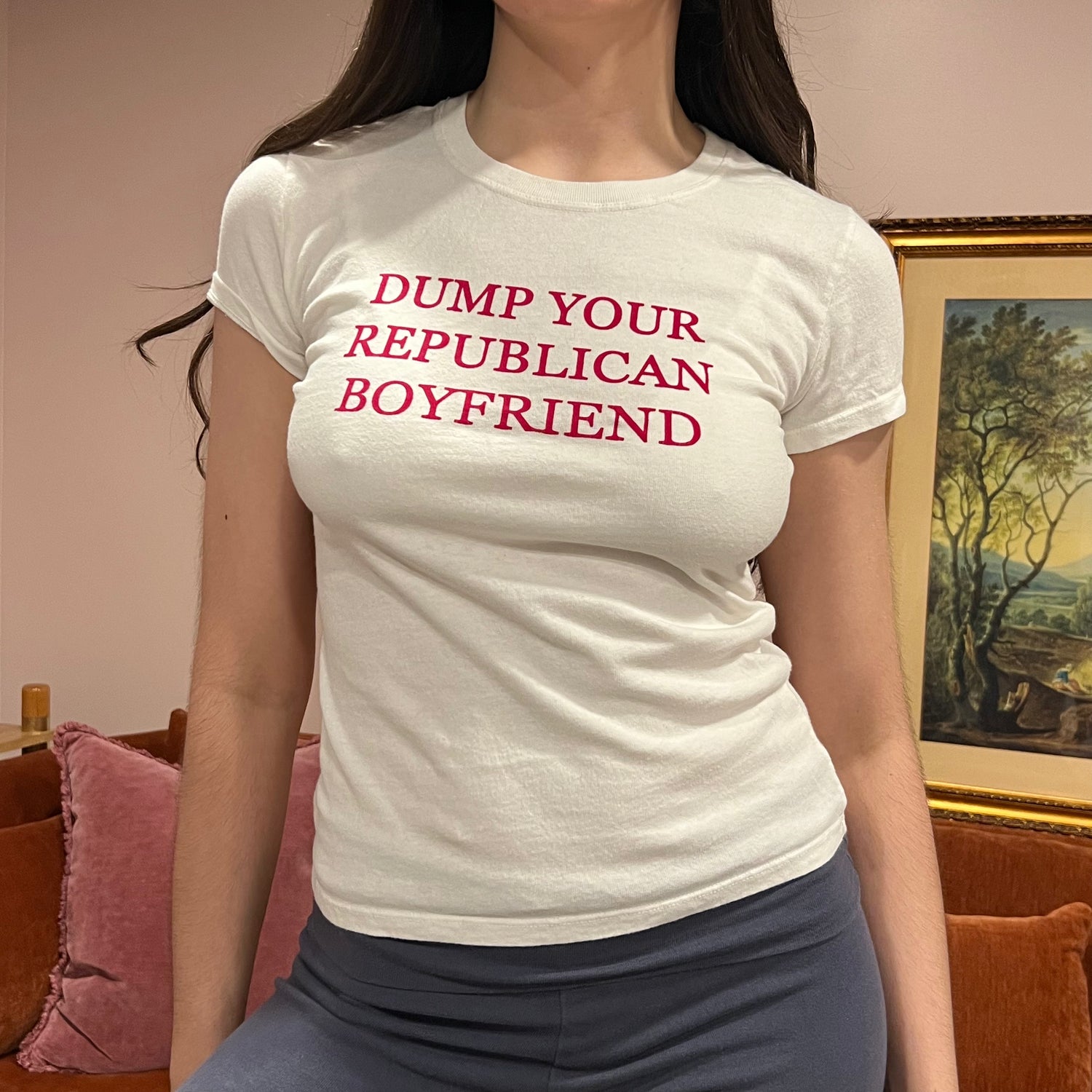 DUMP YOUR REPUBLICAN BOYFRIEND white t-shirt with red text (S)